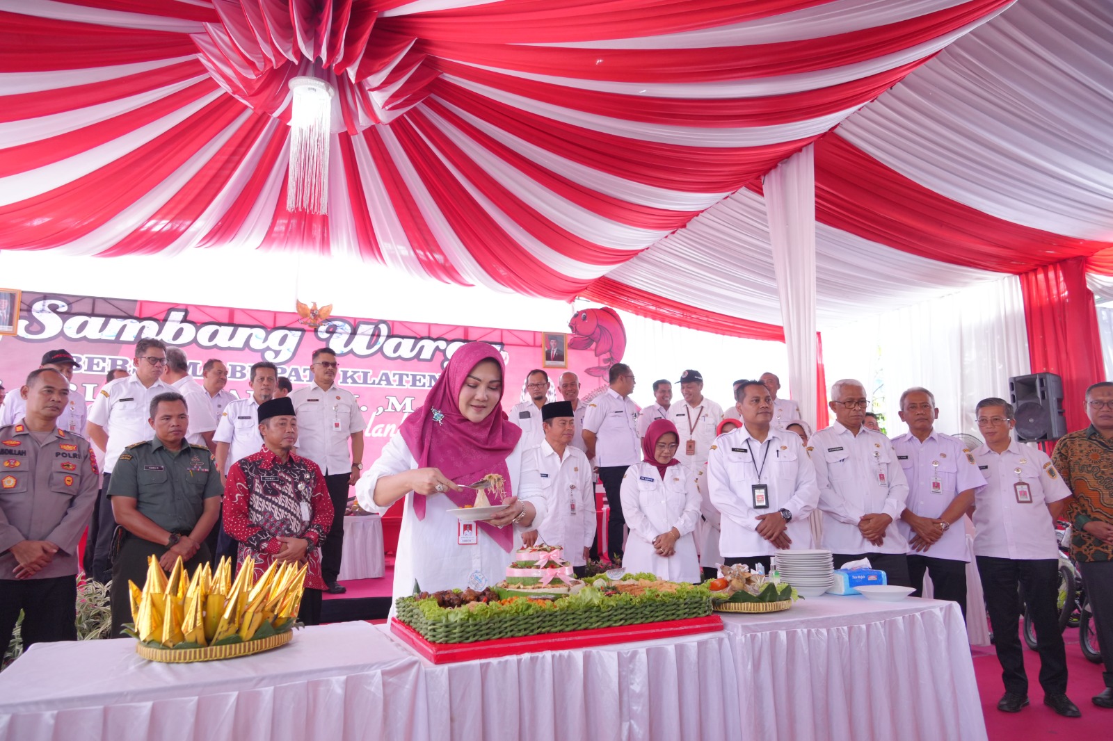 Sebanyak 26 tumpeng nasi lengkap dengan lauk pauknya,merupakan gambaran 26 kecamatan yang telah diselenggarakan program Sambang Warga meramaikan dalam agenda serap aspirasi Pemerintah kabupaten Klaten itu.