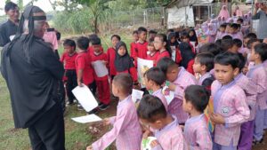 Ki Djoko Sutedjo sedang menceritakan tentang sifat jahat wayang Sengkuni kepada murid murid SD dan TK